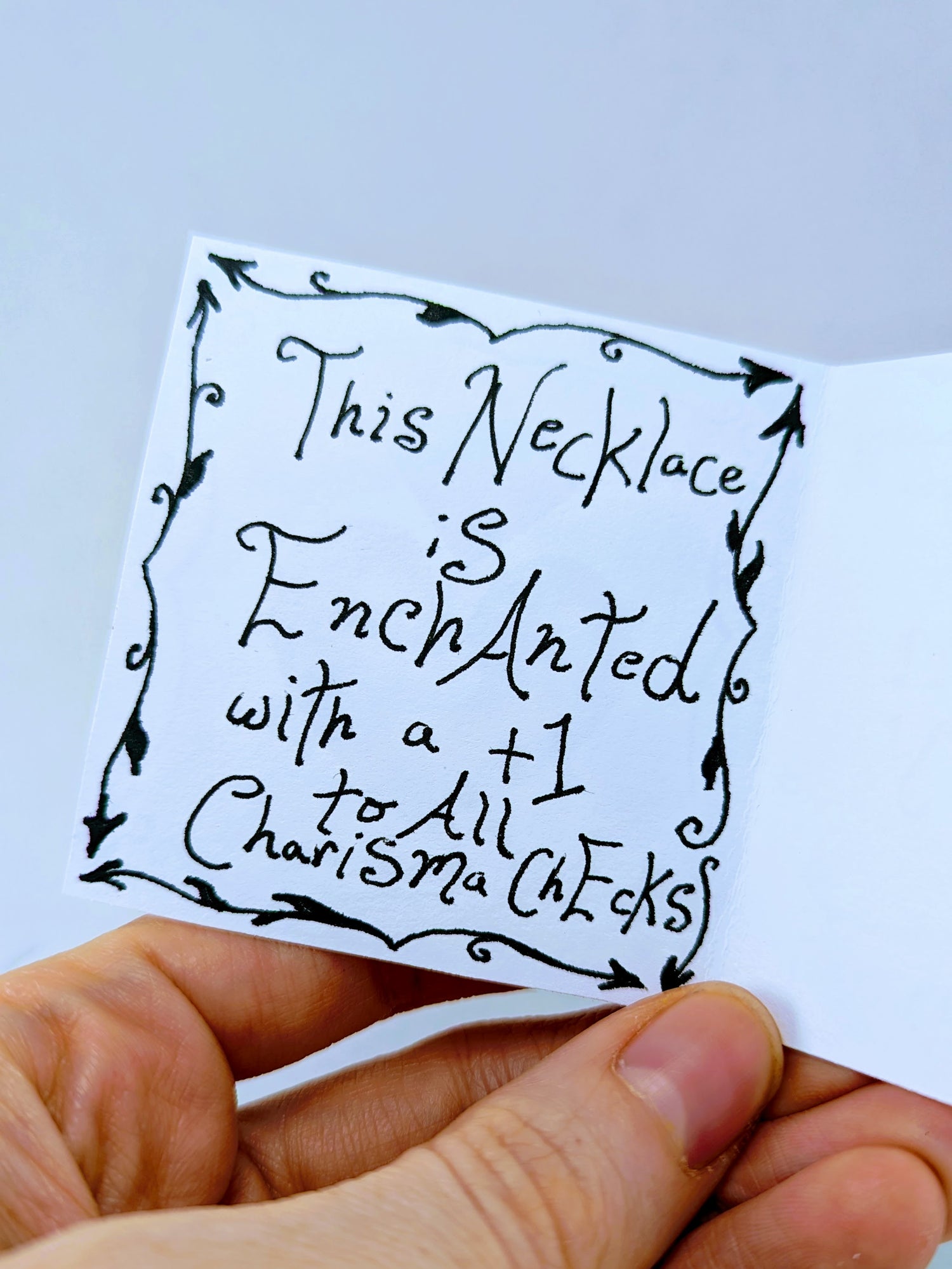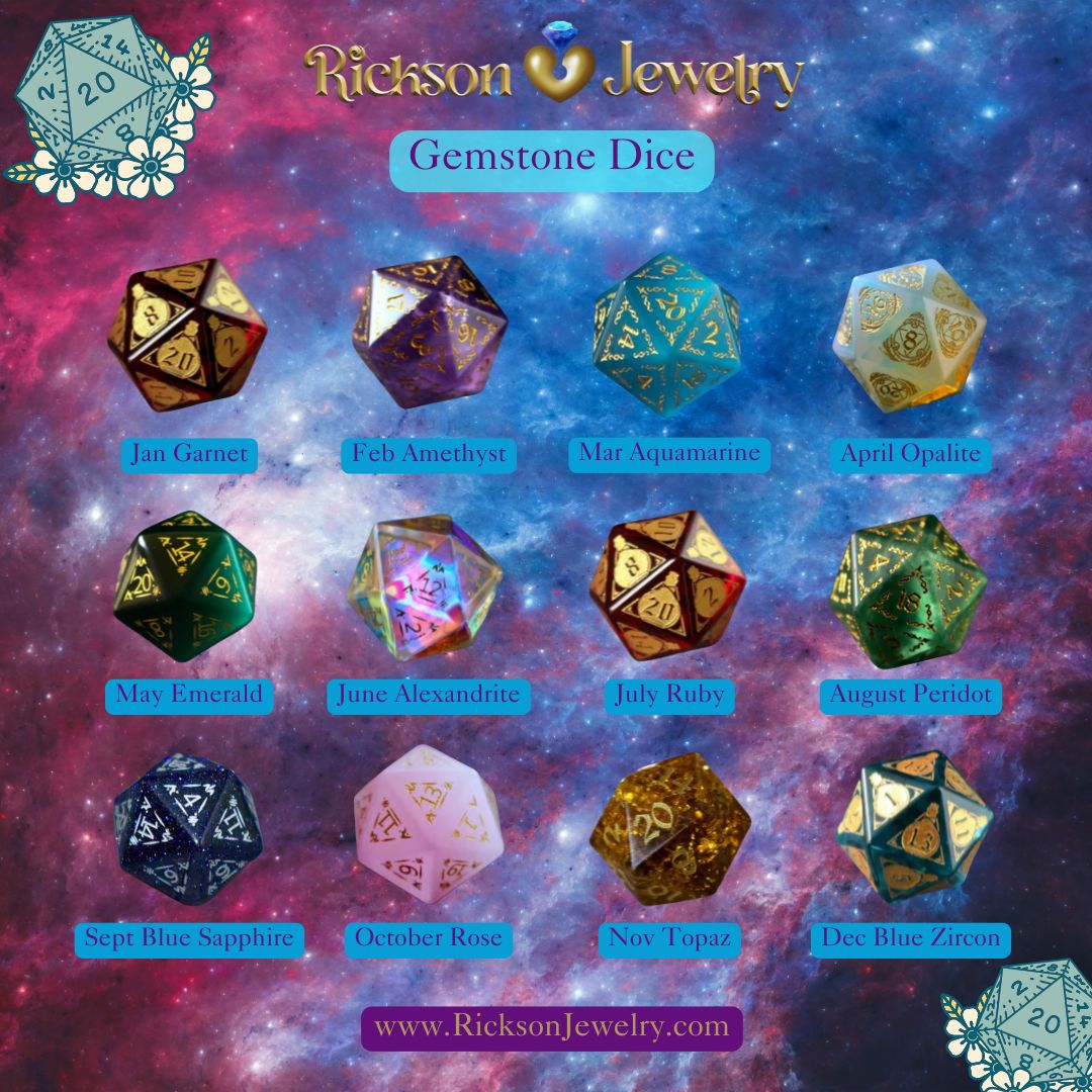 Our interchangeable DND Dice Necklace is available with or without a hand-carved gemstone dice in your choice of birthstone. *Note not all are the genuine gemstone for example blue sapphire is blue sandstone. Also available: dichroic glass, amethyst, green fluorite, blue cats eye, green cats eye, red zircon glass, and opalite, with mage furry, health potion, and dragon shield gold carvings.