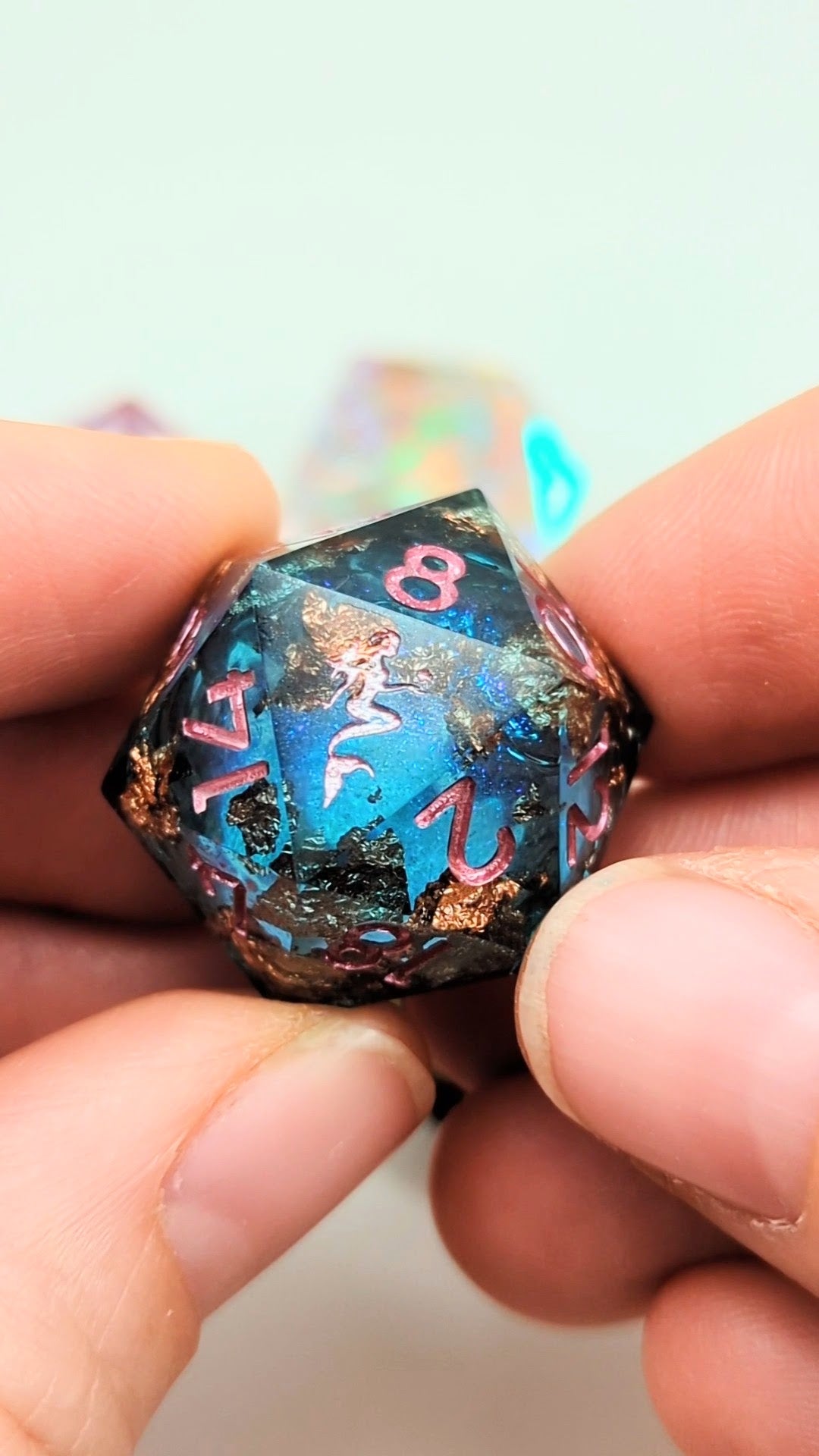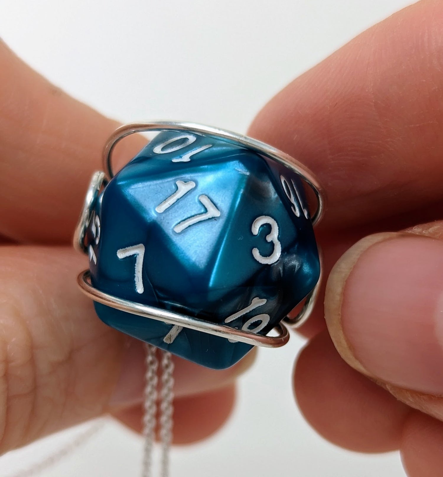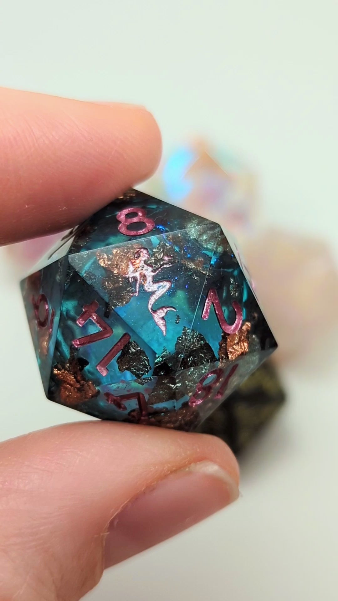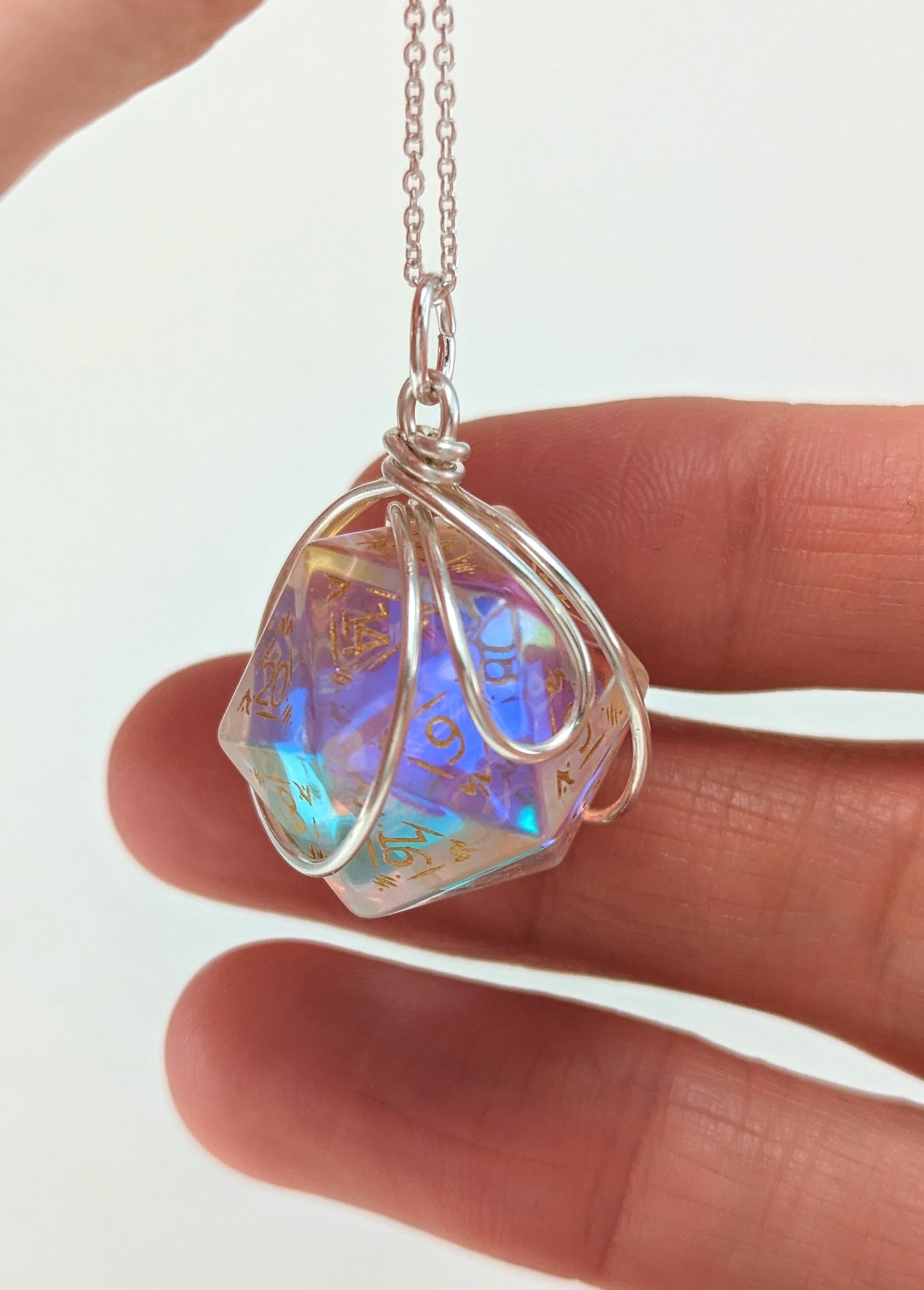 NEW liquid core Mermaid, Fairy Sparkle and Labradorite D20 dice: first 3 photos! Also view them in the first video. The visual chart shows Birthstone dice, and you can select the new and birthstone dice at checkout. 🤗 Spice up your Dungeons & Dragons nights with the Interchangeable DND Dice Necklace! Showcase your favorite dice with this stunning sterling silver or gold filled necklace. Quality craftsmanship ensures no dice will fall out, guaranteeing you'll always roll a natural 20. Snap 'em in, rock 'em out!
