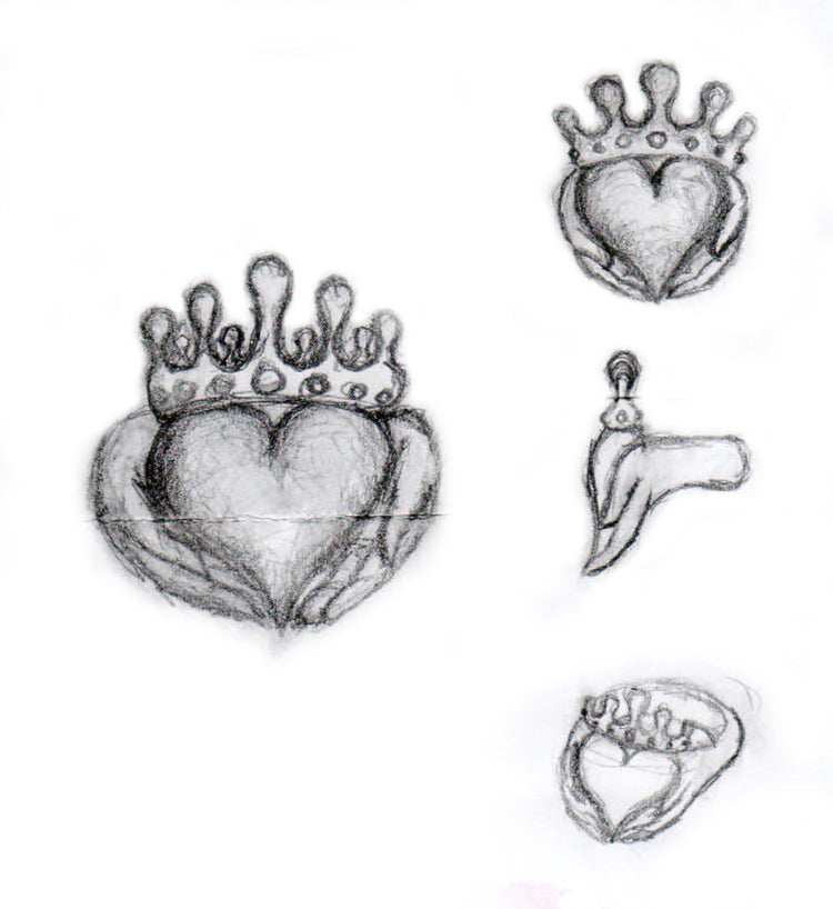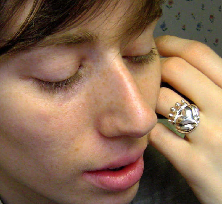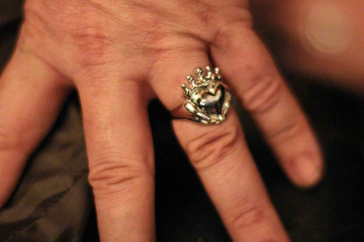 Claddagh rings are traditional Irish Promise rings, but this hand-carved ring is far from conventional. The hands gently cup a huge heart, with a rockabilly crown making it the perfect 'gift for her'. My Claddagh features two hands gently cupping a heart, creating an affectionate image of love and tradition.