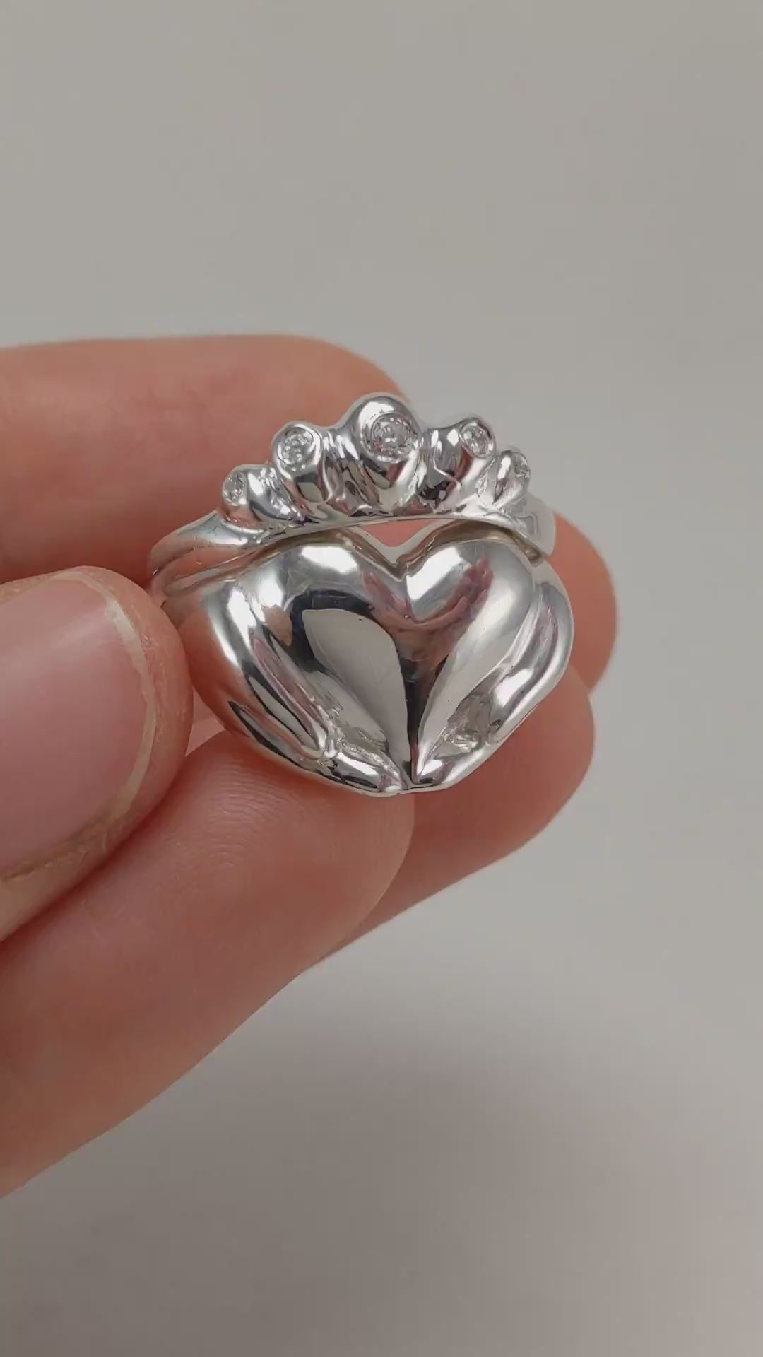 This is my classic Claddagh ring with a twist! I've created two unique and beautiful rings from one stunning design. The crown has 5 high quality diamonds to symbolize your engagement, while the heart and hands show your devotion and love as a wedding band. The rings fit together to make one gorgeous symbol love, commitment and beauty.