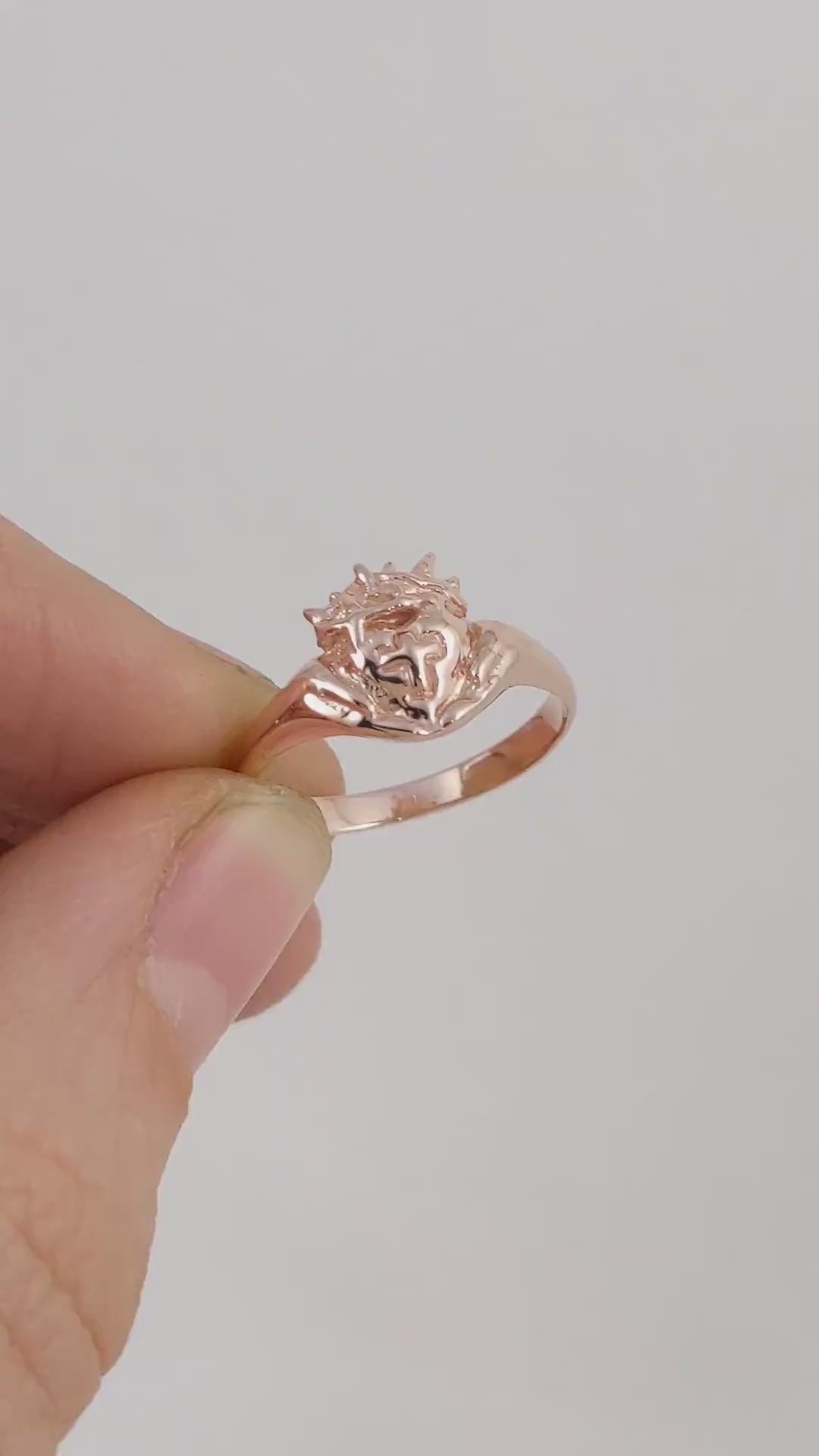 This ring is a beautiful symbol of love and devotion. Two hands lovingly cup a heart with a cross and a crown of thorns. A loving combination of Celtic Claddagh tradition and Religious devotion.