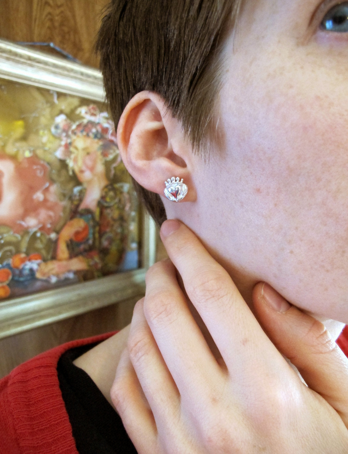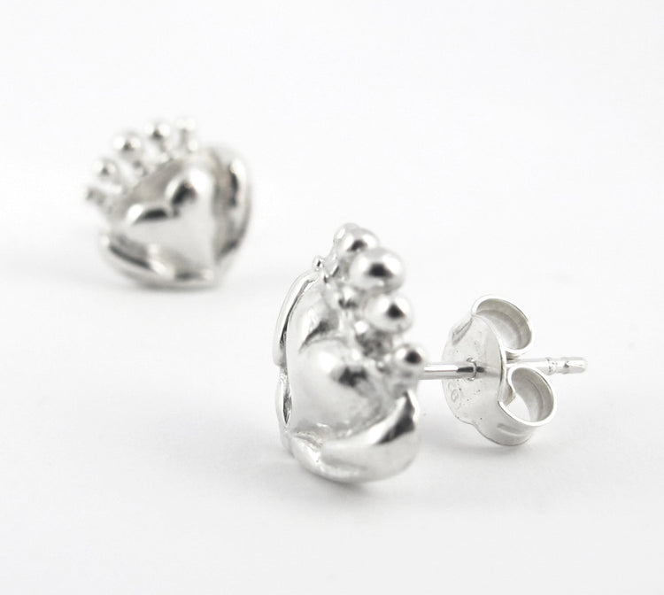Say hello to my long awaited Claddagh Stud earrings! Crafted completely due to popular demand! Alright already, I'll make them! Lol The Claddagh symbol is used in traditional Irish promise jewelry but my hand carved sterling silver Claddagh studs are far from conventional. The hands gently cup a puffy silver heart, with a Rockabilly crown making it the perfect 'gift for her'. My Claddagh is different because it features two hands gently cupping a heart, creating an affectionate image of love and tradition. Theses sterling claddagh earrings are also great for sensitive ears because they are nickle free, and entirely sterling silver, the claddagh, the posts, and the backings. The hands are there for friendship, The heart is there for love. For loyalty throughout the year, The crown is raised above.