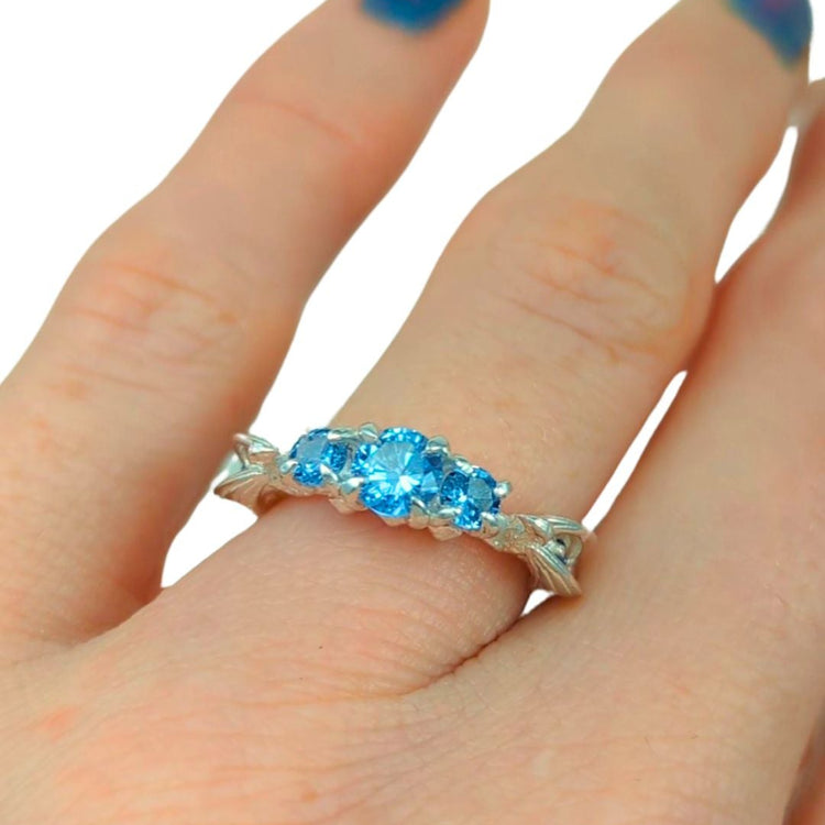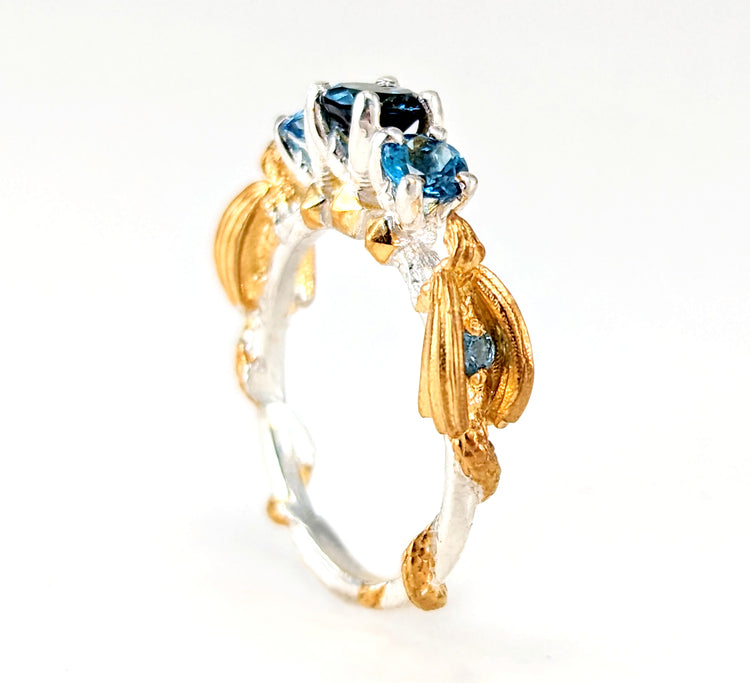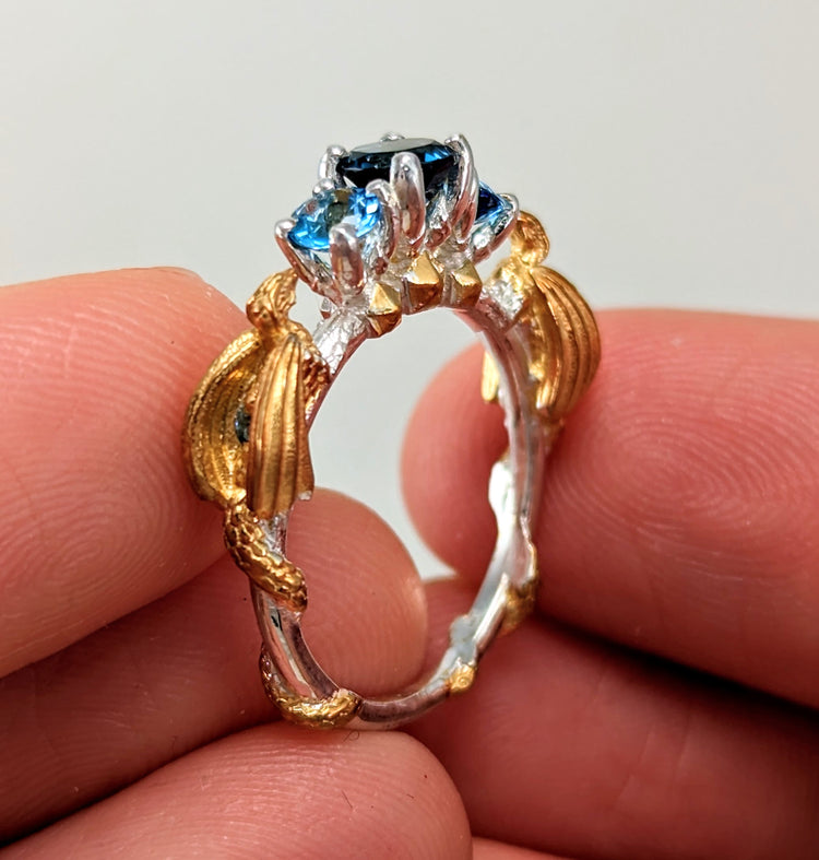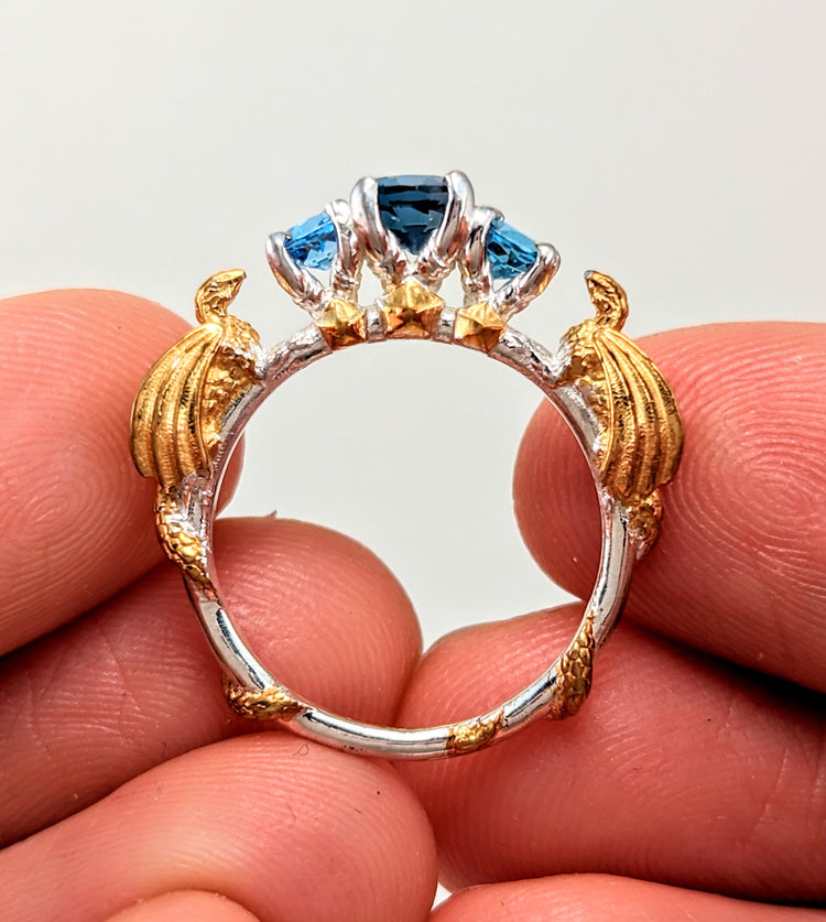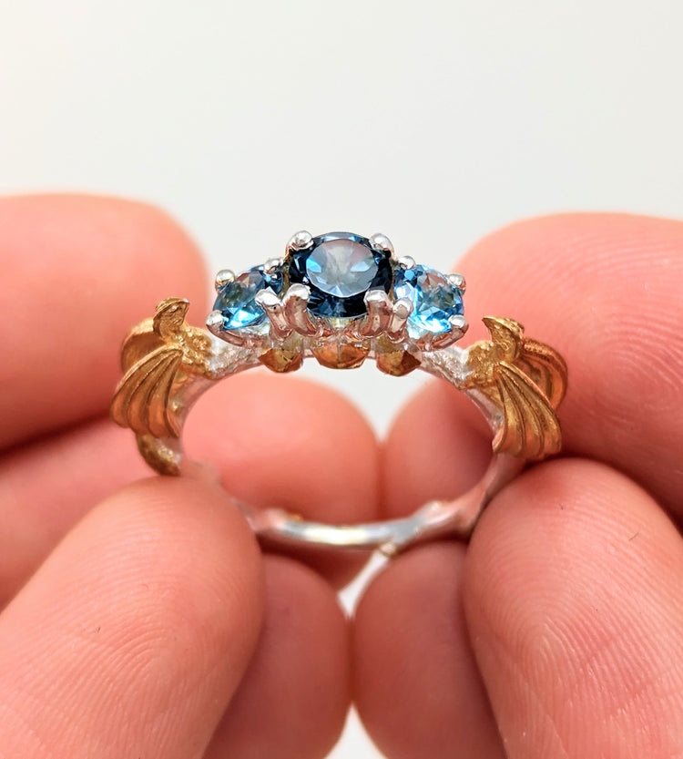 -Silver + Blue topaz and gold options comes with genuine blue topaz stones like the photos (Center is london blue, sides swiss blue, wings sky blue).