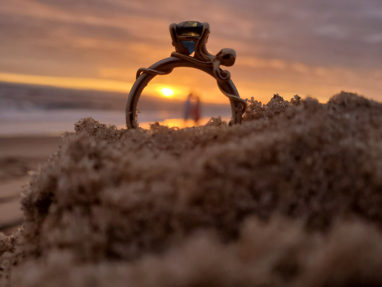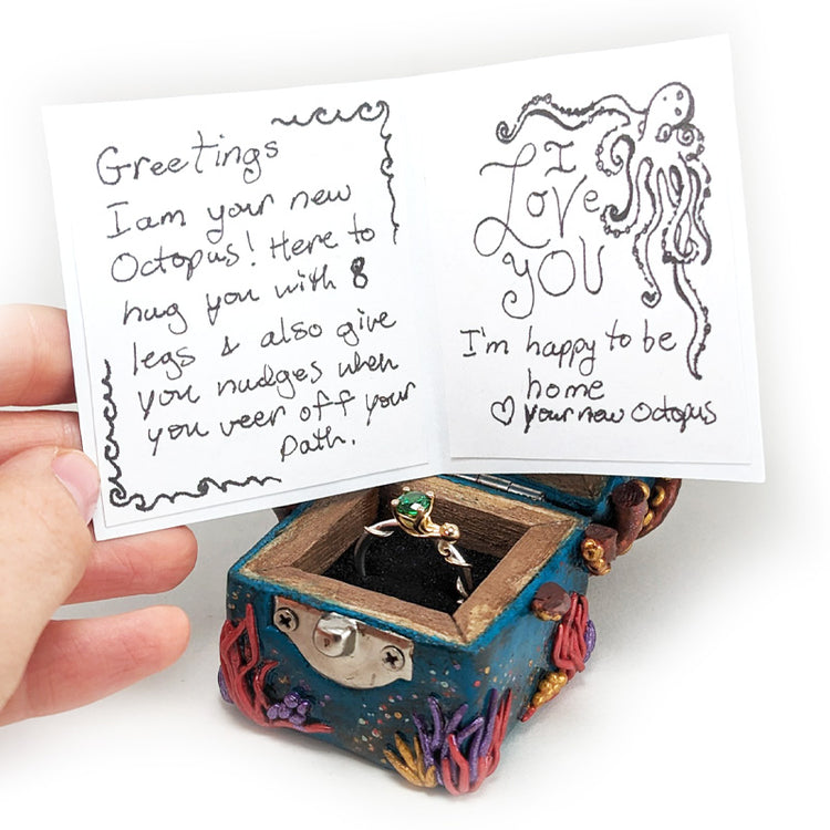 This handmade Octopus tentacle wedding band is the perfect unique engagement ring for the cephalopod enthusiast. The Octopus Wedding band set has been created due to popular demand. Clients just keep asking for a matching wedding band! I just had to deliver. This unique engagement and wedding ring set features 8 golden tentacles curling round a solid sterling silver (or gold) band and the engagement ring has the tentacles reaching up to hold a CZ emerald stone (genuine available, message for a quote). A truly beautiful piece of Octopus Jewelry.