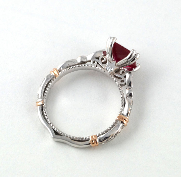 This Victorian inspired ring is every girls dream ring. Fit for a Disney Princess! A beautiful harmony of vintage, antique, Victorian, and art deco styles creates the perfect ring for your proposal. This unique, yet classic engagement ring has smooth curves, and an elegant shape creating an antique, feminine feel with modern strength and style.