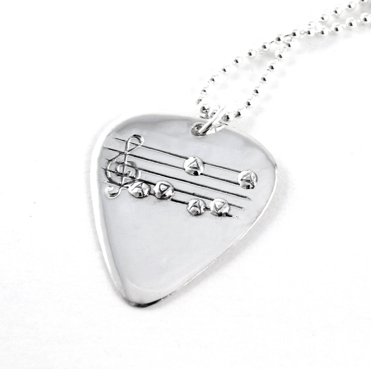 I love making these custom sterling, guitar pick necklaces because I get to hear such wonderful music! I transcribe the real notes to your choice of song onto a sterling silver guitar pick! Exact guitar pick replica, you can even use it to play guitar! No sheet music required, simply tell me the artist and song title, and I take care of the rest.