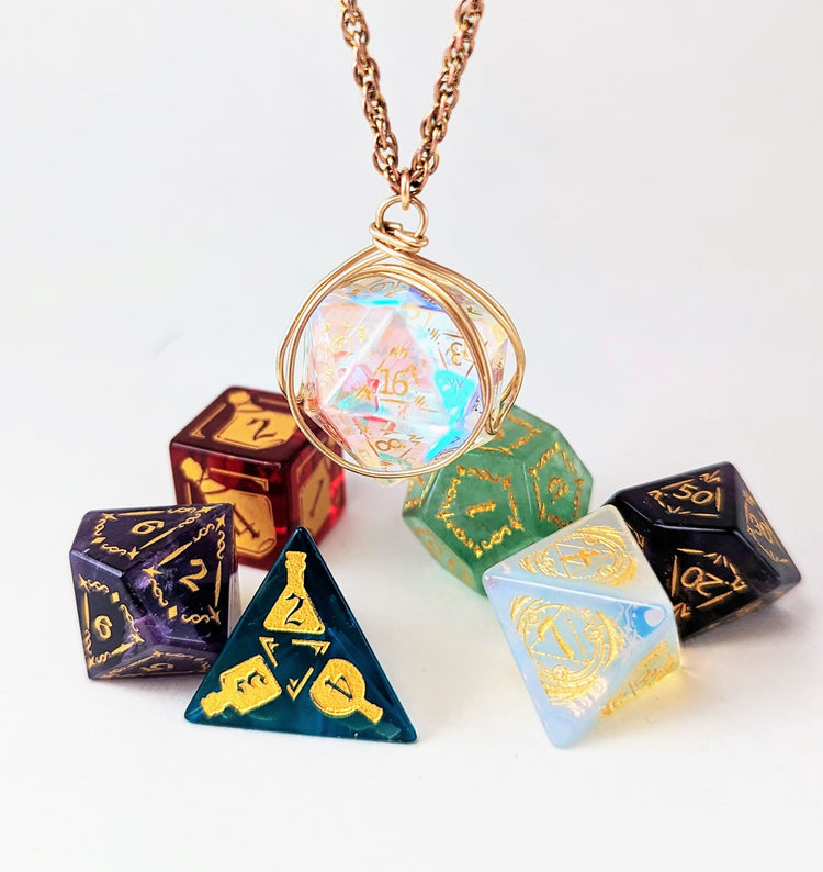 Our interchangeable DND Dice Necklace is available with or without a hand-carved gemstone dice in your choice of birthstone. *Note not all are the genuine gemstone for example blue sapphire is blue sandstone. Also available: dichroic glass, amethyst, green fluorite, blue cats eye, green cats eye, red zircon glass, and opalite, with mage furry, health potion, and dragon shield gold carvings.