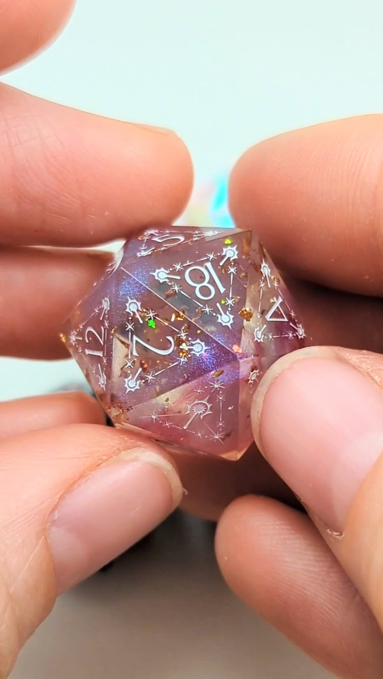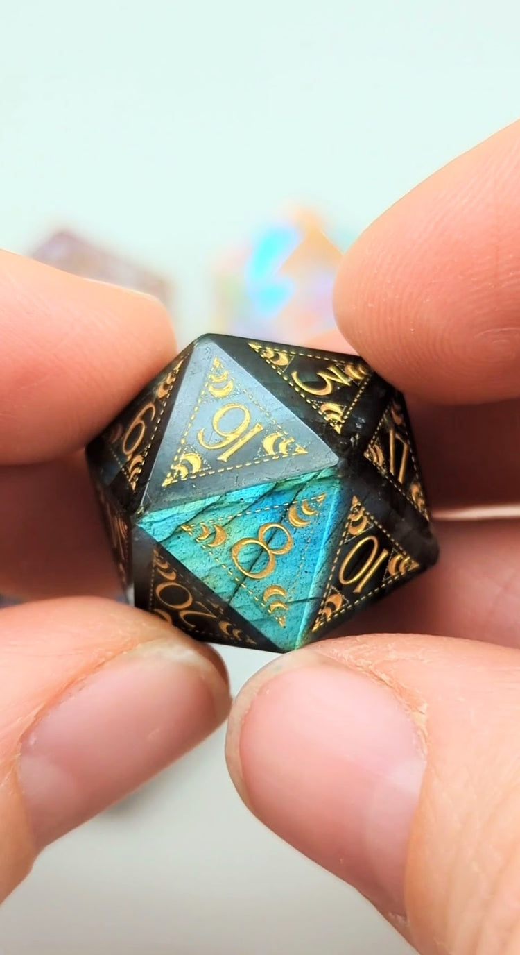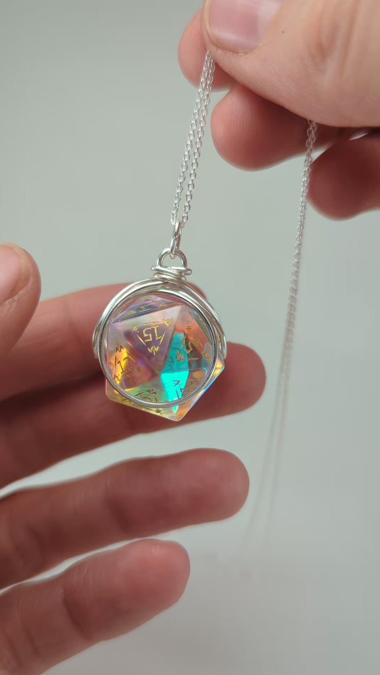 NEW liquid core Mermaid, Fairy Sparkle and Labradorite D20 dice: first 3 photos! Also view them in the first video. The visual chart shows Birthstone dice, and you can select the new and birthstone dice at checkout. 🤗 Spice up your Dungeons & Dragons nights with the Interchangeable DND Dice Necklace! Showcase your favorite dice with this stunning sterling silver or gold filled necklace. Quality craftsmanship ensures no dice will fall out, guaranteeing you'll always roll a natural 20. Snap 'em in, rock 'em out!