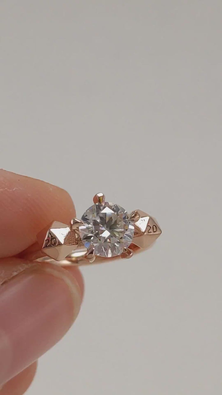 Our Custom ring is worthy of any D&D player. Featuring a Large Center stone which can be a genuine or Lab grown Diamond, Moissanite, CZ or any stone of your choice. Flanked by D20 dice this ring is simple, elegant and a beautiful homage to your love of the game. The prong settings are also shaped like Dragon claws adding a finishing touch! Amazing, craftsmanship and a homage to the Dungeons and Dragons fantasy tabletop role-playing game. A fabulous nerd engagement ring or cosplay piece to add to your collection.