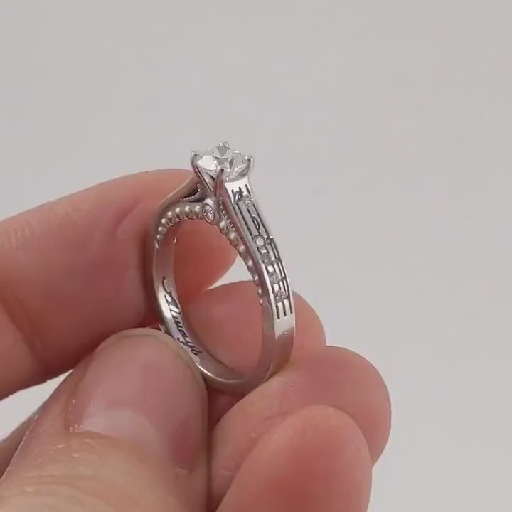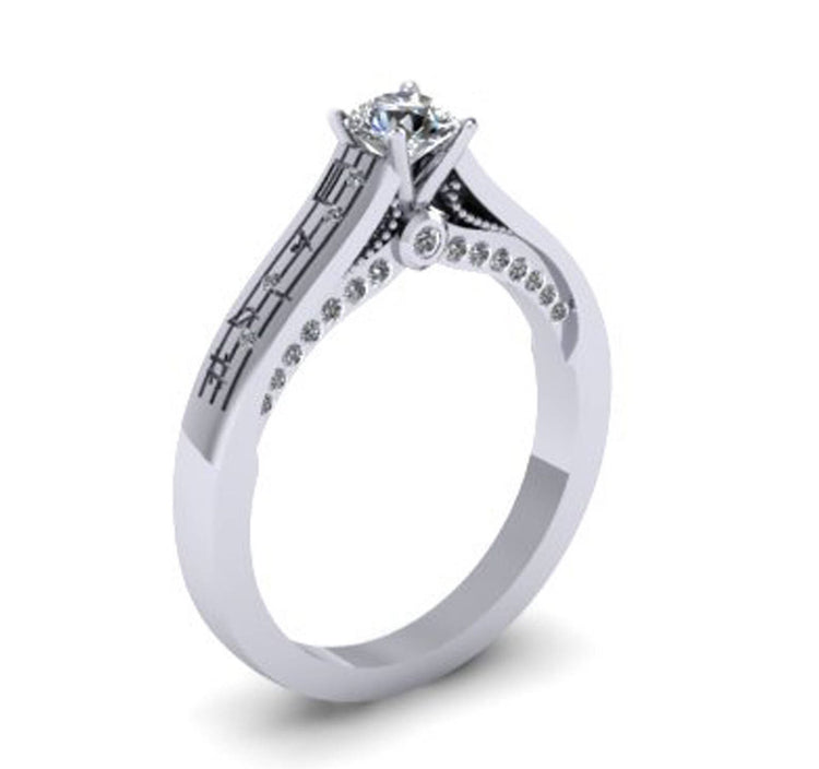 Gorgeous Music Note Engagement ring featuring the notes to your choice of song! Ideal for musician engagements, and music themed weddings. This is for 1 engagement ring. We also carry a matching set which features 2 rings. Available in silver, gold or platinum. Can be customized to fit different shaped center diamonds, princess, cushion, oval etc, and you can request a different gemstone for the center, or the notes. Message for a quote.